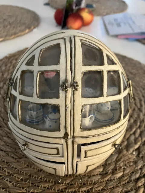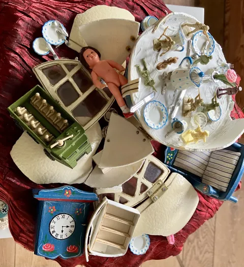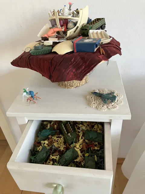 Installation aus Teilen eines zerbrochenen Straußeneis, und Teilen einer darin eingebauten Puppenküche. Plastiksoldaten, Baumstumpf, Tisch mit Schublade und Plastiksoldaten