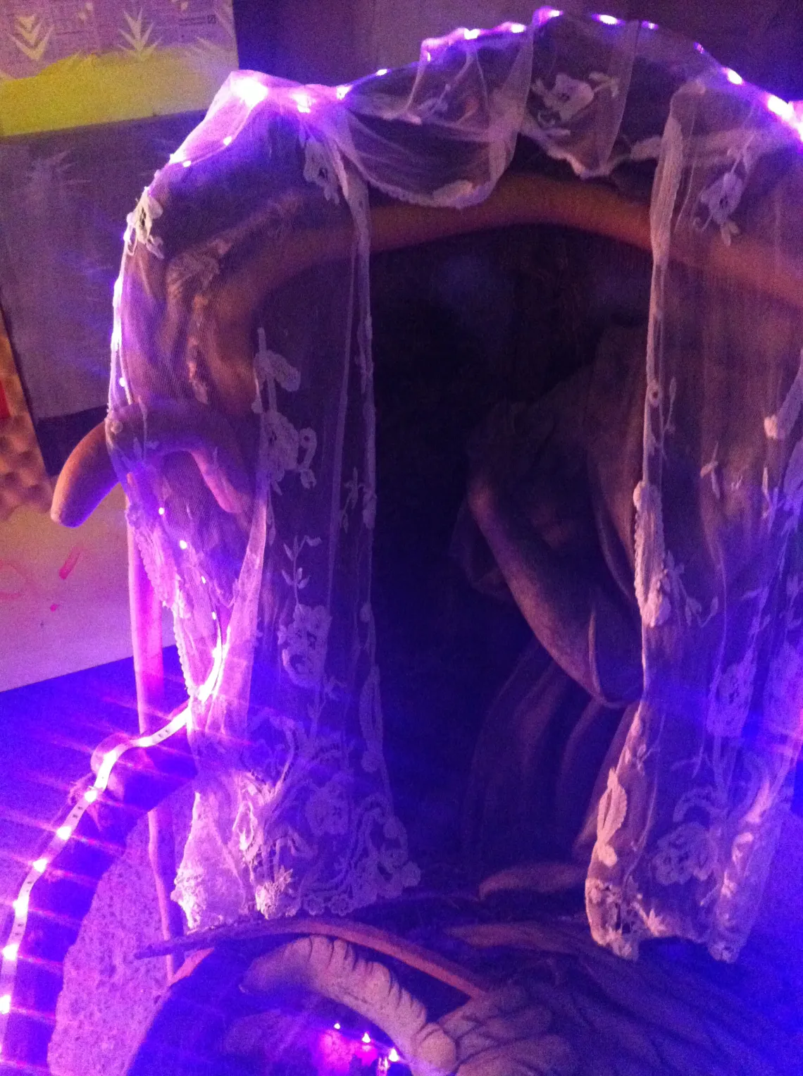 Installation im Atelier mit einem barocken Sessel (Im Sperrmüll gefunden) und LED´s