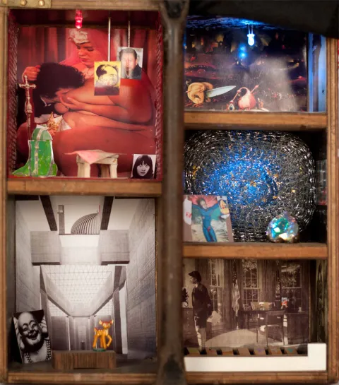 Ehemaliger Nagelkasten der Schreinerei READYMADE in Hürth. Verschiedene Räume symbolisierend, in denen geheimnisvolle, mysteriöse Objekte zu entdecken sind. Der Hintergrund eines Raumes ist mit einer Zeichnung aus dem Werk von Simon Ungers "Sakrale Räume" ausgefüllt. Oben rechts ein Raum in dem im Vordergrund der Papst Johannes Paul II als Silhouette dargestellt ist. Dahinter, als Fotografie, eine Frau mit entblößter Brust, einen Mann im Anzug säugend. Auf einem kleinen Tisch davor, liegen fiktive Pläne zum Anschlag des 9. Septembers 2001. Von der Decke hängend, Fotografien von Ulrike Meinhoff, Pol Pot und Mao. Unter dem Tisch das Zitat eines israelischen Künstlers in Form eines Teppichs mit Hitlerdarstellung. Im mittleren, linken Raum Fotografie eines Bildes von Jesus am Kreuz mit Einkaufstüten an den Armen hängend.