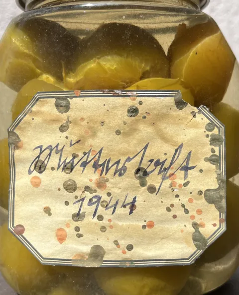 "Ich finde diese eingeweckten Früchte im Keller meiner Oma, sie schweben im eigenen Saft wie ein Embryo im Mutterleib. Unter dem Schutt der Zeit erinnern sie an das überleben unter widrigen Bedingungen"