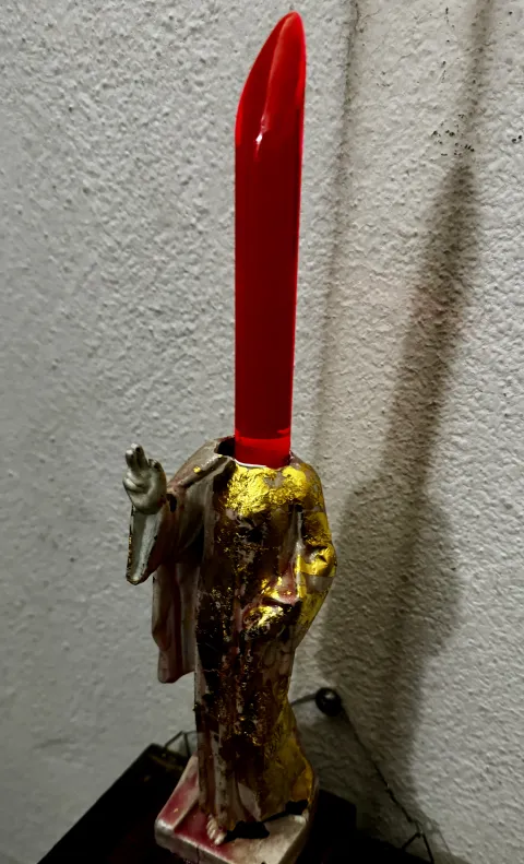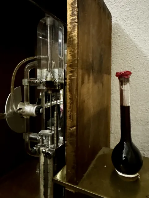 Holzkasten mit Teilen einer Laboreinrichtung, Jesusfigur, Lisaplastic, Phiole mit Wein