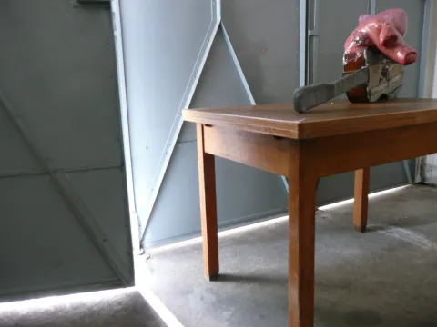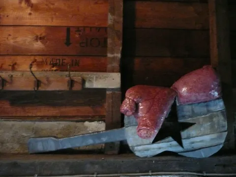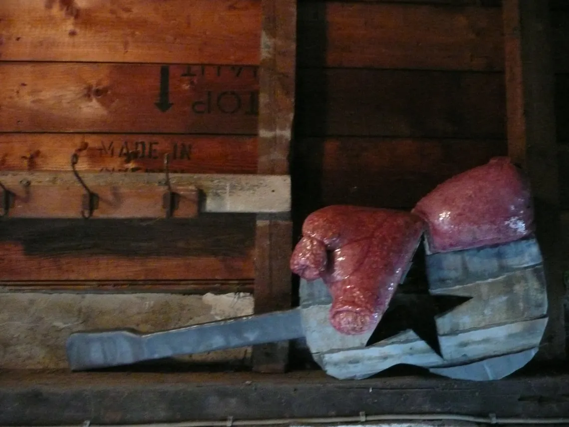 2007 Objekt Technik Skulptur Gitarre mit Blei und Zinkblechen ummantelt, mittig ein Stern aus zerschnittenen Festplatten, oben Dinkel mit Epoxidharz in Nylonstoff. Hard disc Best off