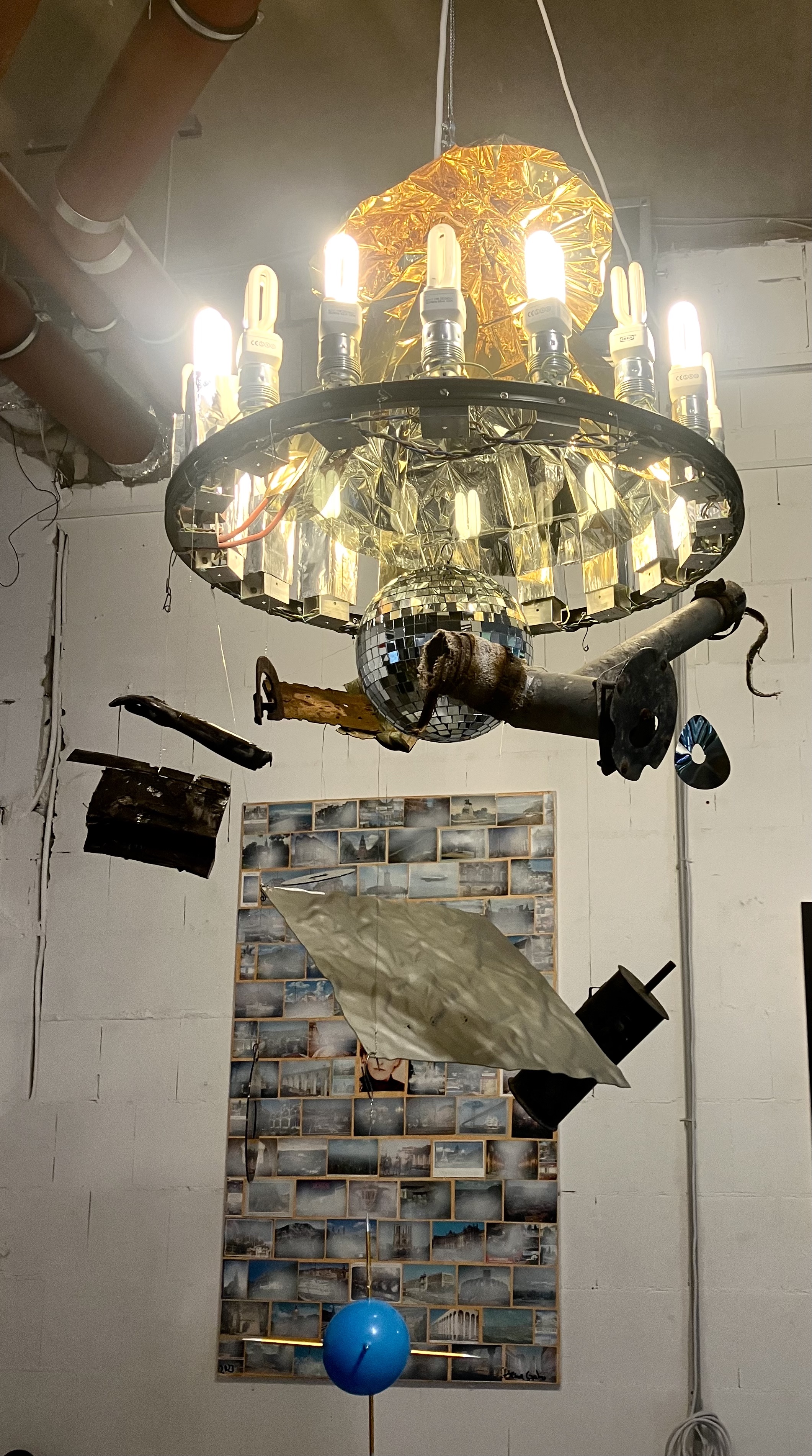 Installation aus Allibert Badezimmerschrank, Bauschaum, Fotos, diversen Hygiene Artikeln.