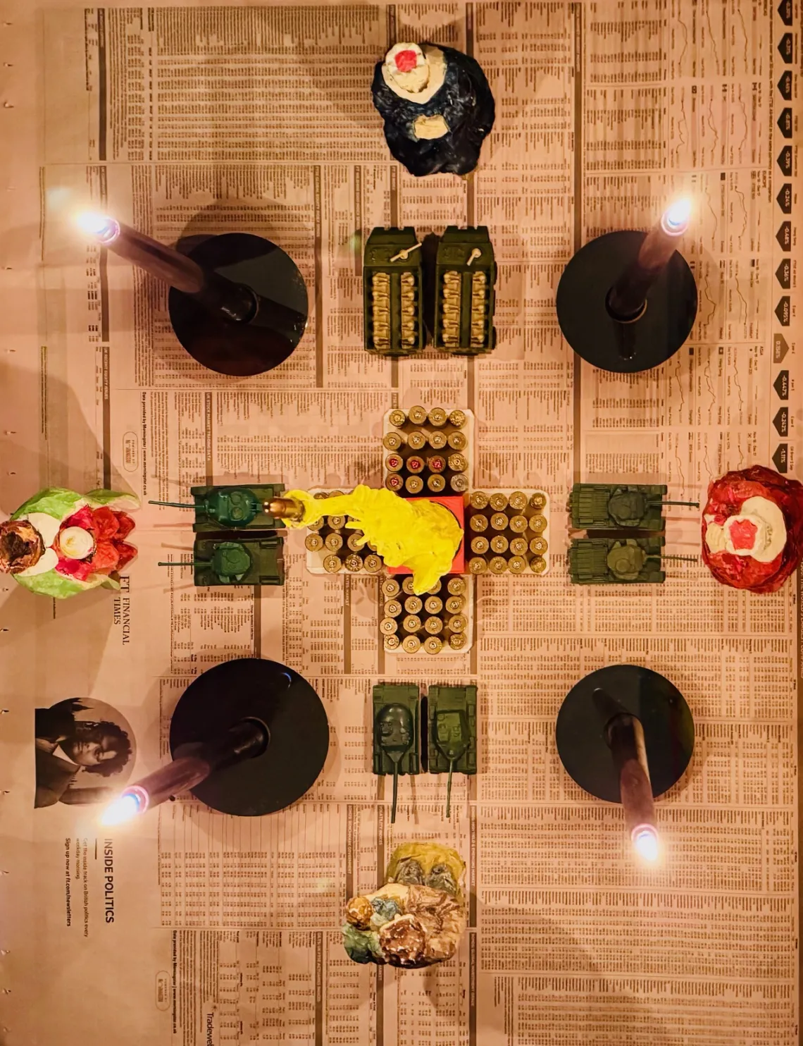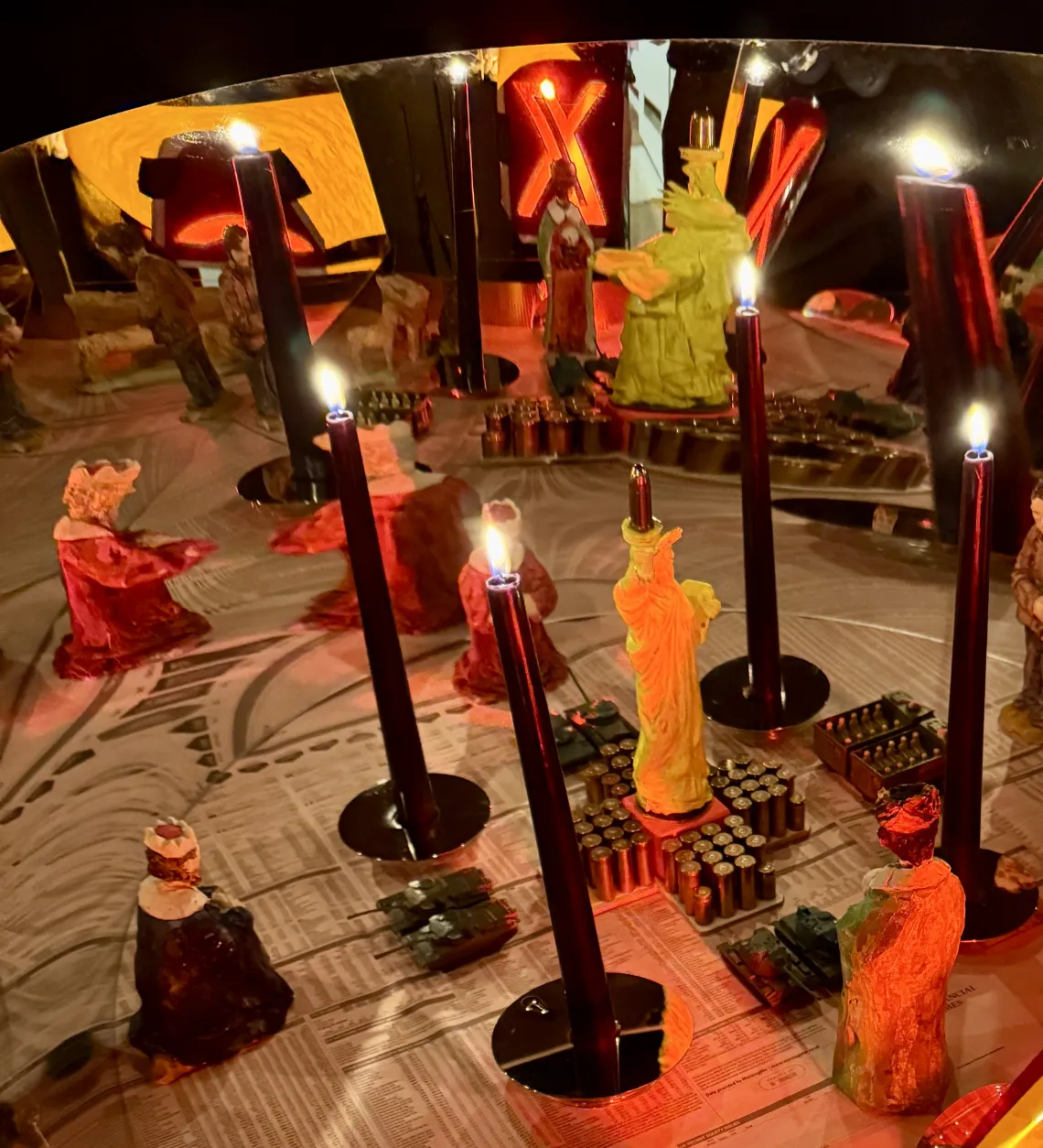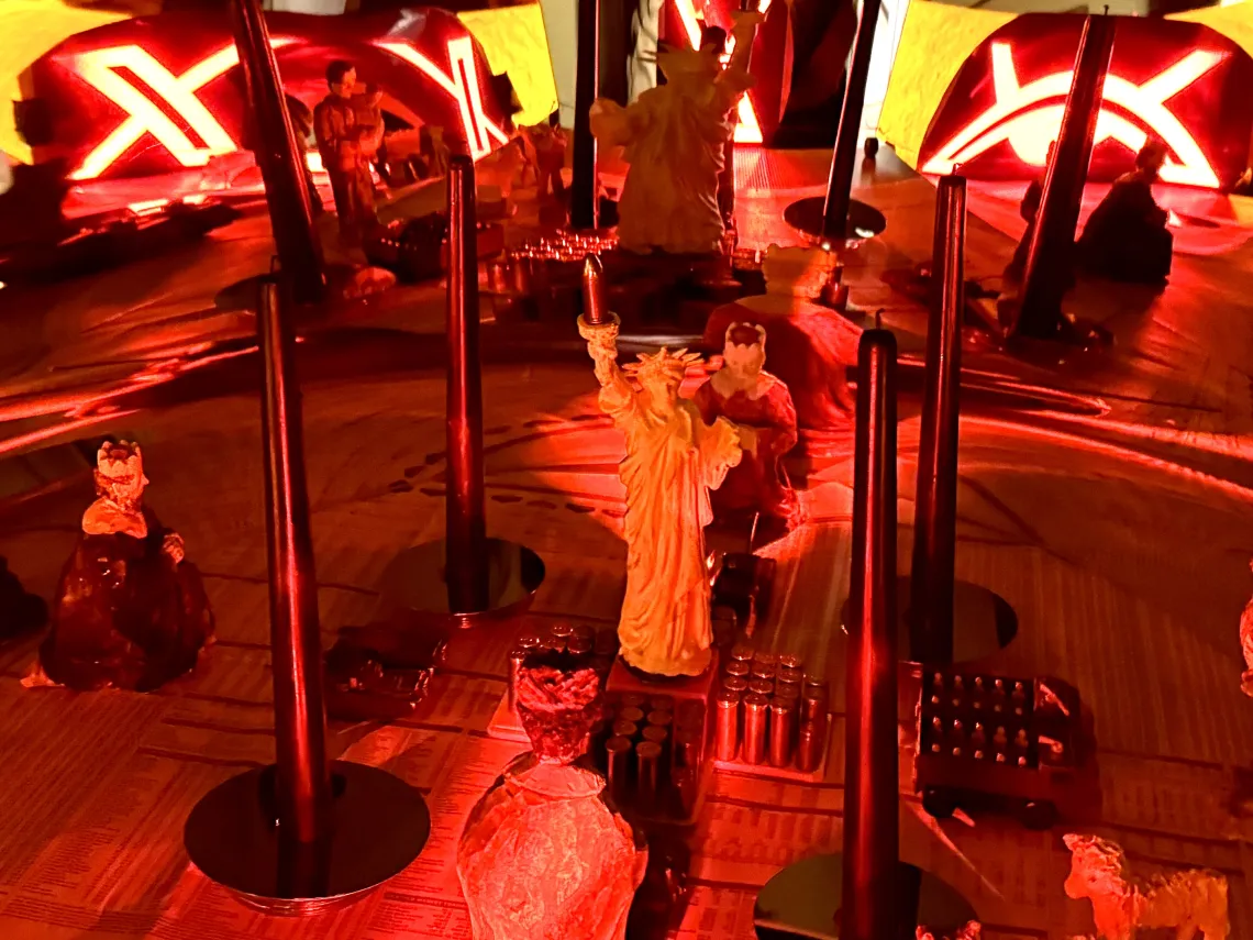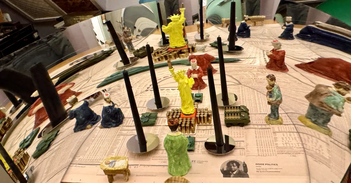 2024 Installation Mixed Media aus Liberty (Freiheitsstatue), Krippenfiguren, Harddisk (Festplatten), Panzern, Spiegel, Börsenkurse America Trump Kapitalismus