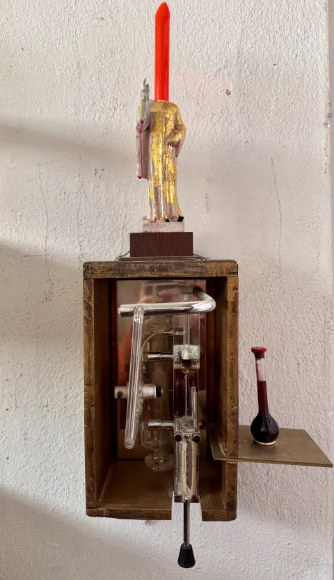 Holzkasten mit Teilen einer Laboreinrichtung, Jesusfigur, Lisaplastic, Phiole mit Wein