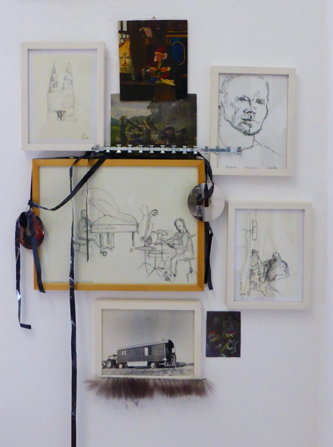Mixed Media aus Fotografien, Zeichnung, Nato Draht, Pelz