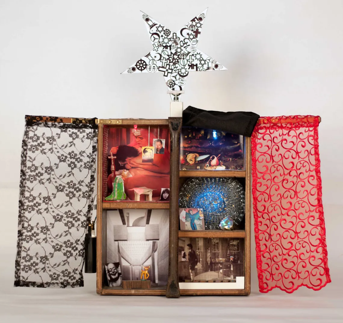 Mixed Media aus einem ehemaligen Nagelkasten der Schreinerei Readymade in Hürth. Verschiedene Räume symbolisierend, in denen Objekte aus der Klavierzerstörung unter anderen zu finden sind. Der Hintergrund des Altarraum des Heiligen Bambis, ist mir einer Kopie einer Zeichnung von Simon Ungers ausgefüllt. Oben rechts ein Raum in dem der Papst Johannes Paul II kniet. Auf einem kleinen Tisch liegen Pläne zum Anschlag des 9. Septembers 2001. Fotografien von Ulrike Meinhoff, Pol Pot und Mao. Unter dem Tisch das Zitat eines israelischen Künstlers in Form eines Teppichs mit Hitlerdarstellung. Im mittleren, linken Raum Fotografie eines Öl Bildes von Jesus am Kreuz  mit Einkaufstüten an den Armen hängend, von Jörn Keseberg gemalt. Der durch ein schwarzes Tuch abgedeckte Raum enthält die traumatisierenden Bilder der jüngeren Geschichte, 9/11, Befreiung des Lagers von Ausschwitz und ein Ausschnitte eines Bildes von Hieronymus Bosch. Einzelne Teile sind durch LED´s beleuchtet. Oben befindet sich ein Sprengknopf aus den Elfenbeintasten eines Klaviers.